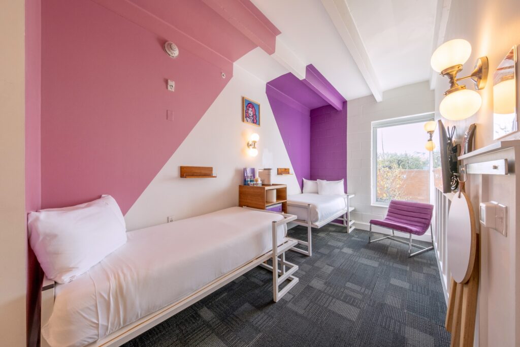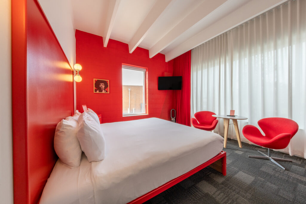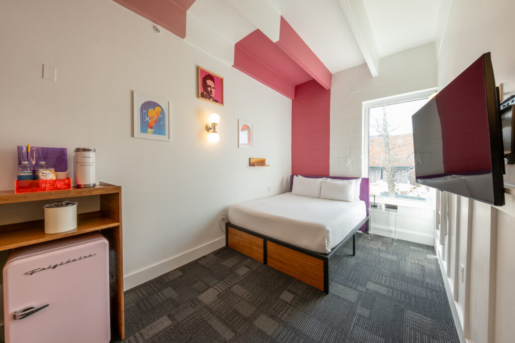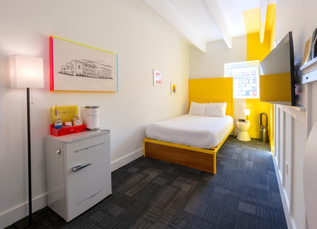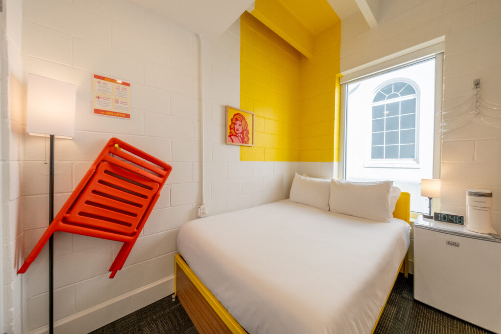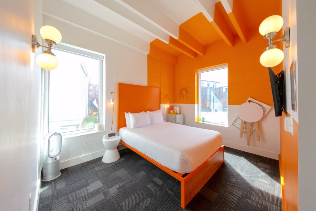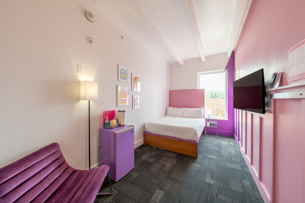 Stay in style! Our colorful king rooms accommodate 2 people with 1 King bed, 1 full bathroom, and much more!