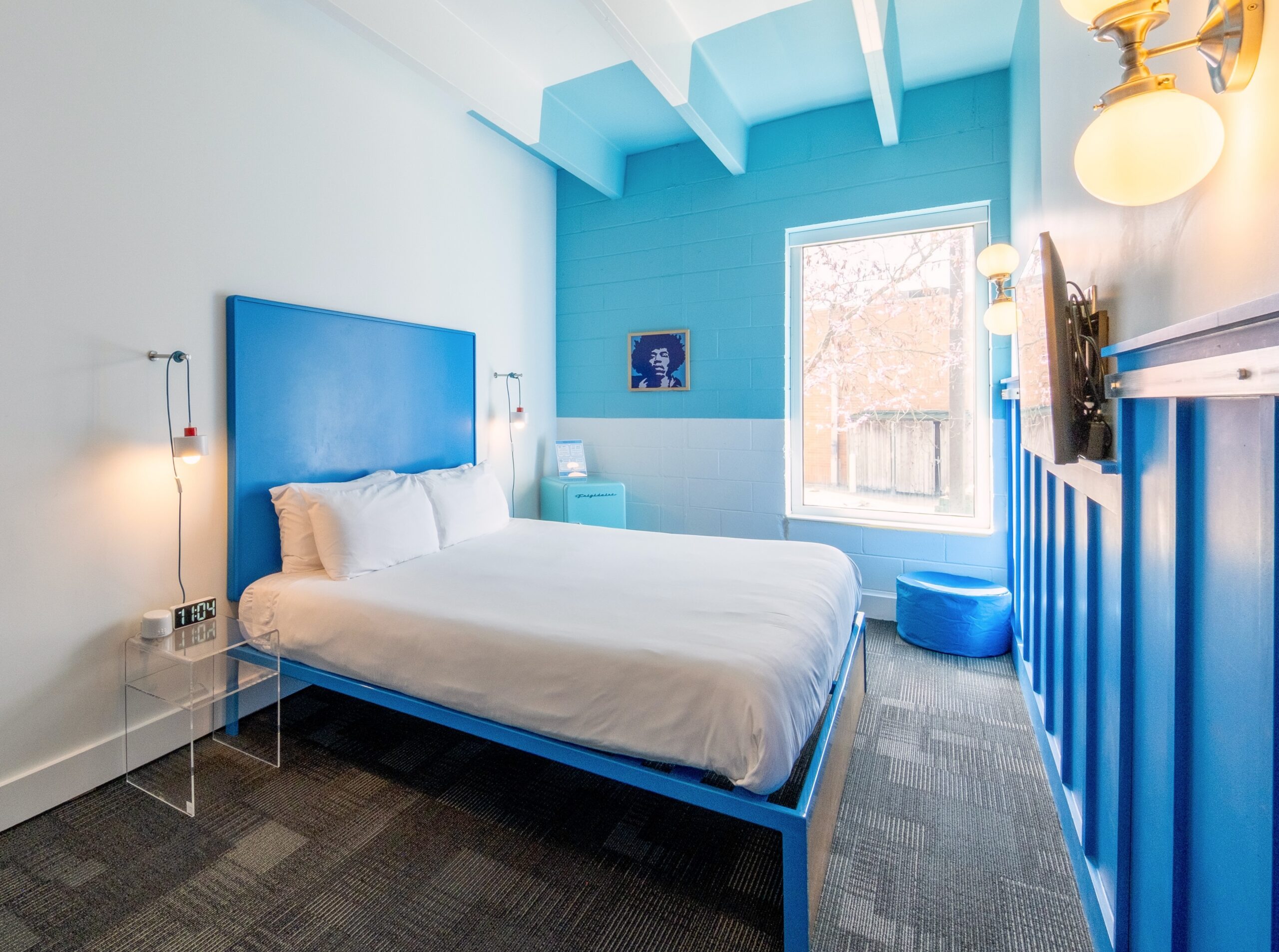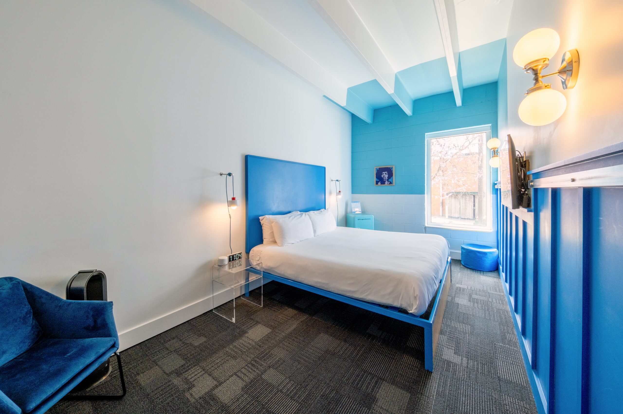 This beautiful King Room 215 features vibrant insta-worthy blue colorblock walls and ceilings, and a unique blue-tiled shower. Attentive features include walls adorned with local art, a dry bar, a small basket of hand-selected local snacks, and much more!