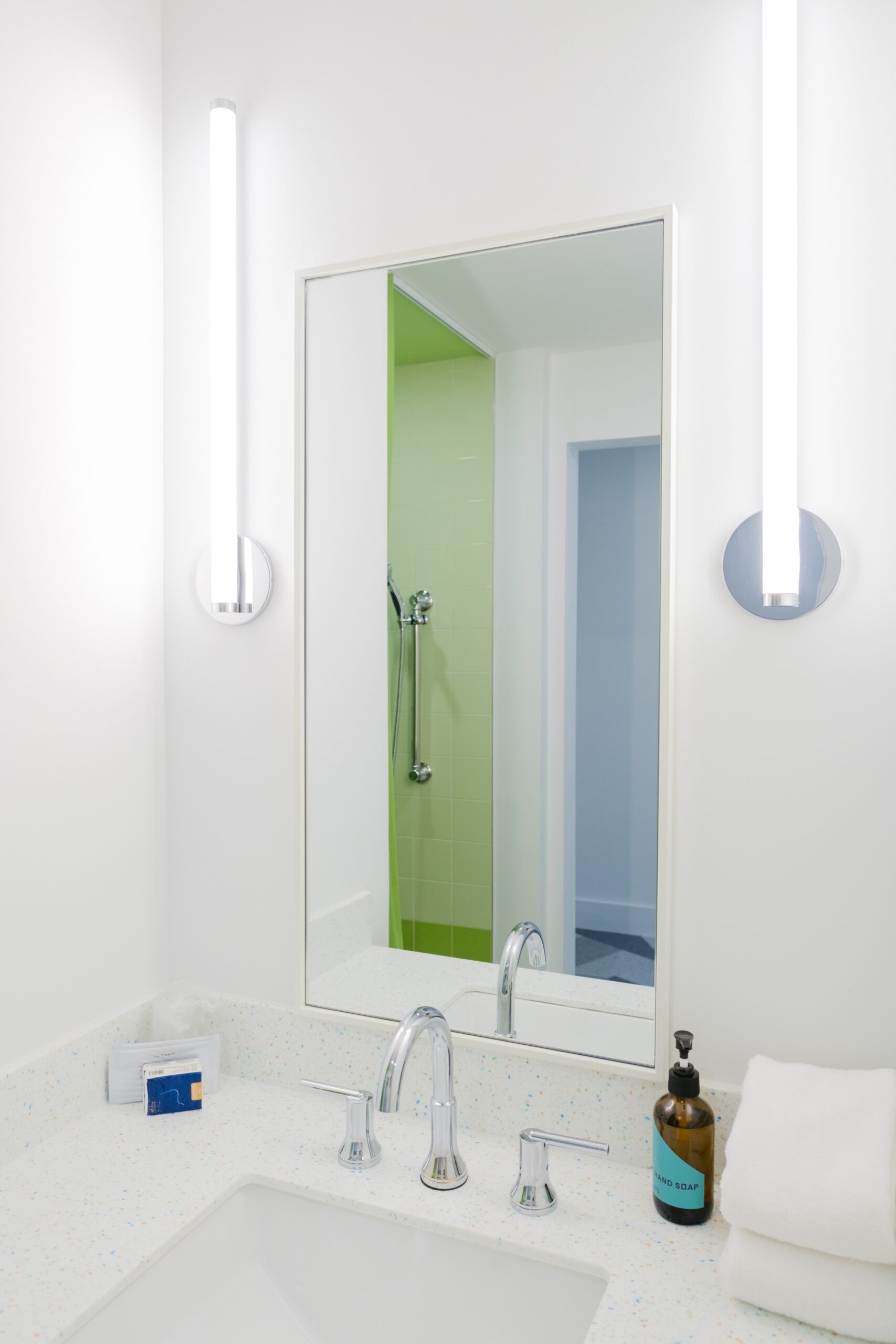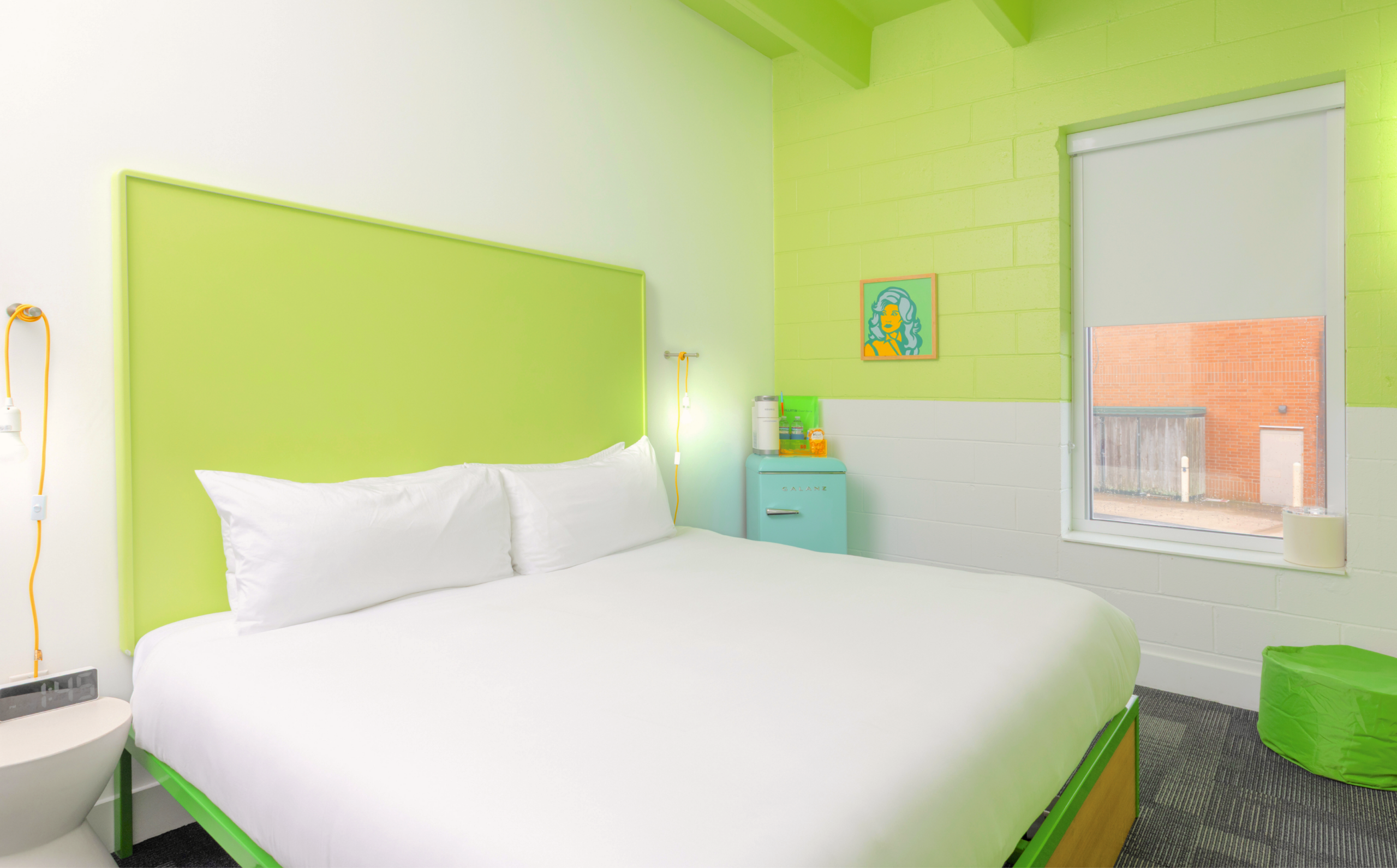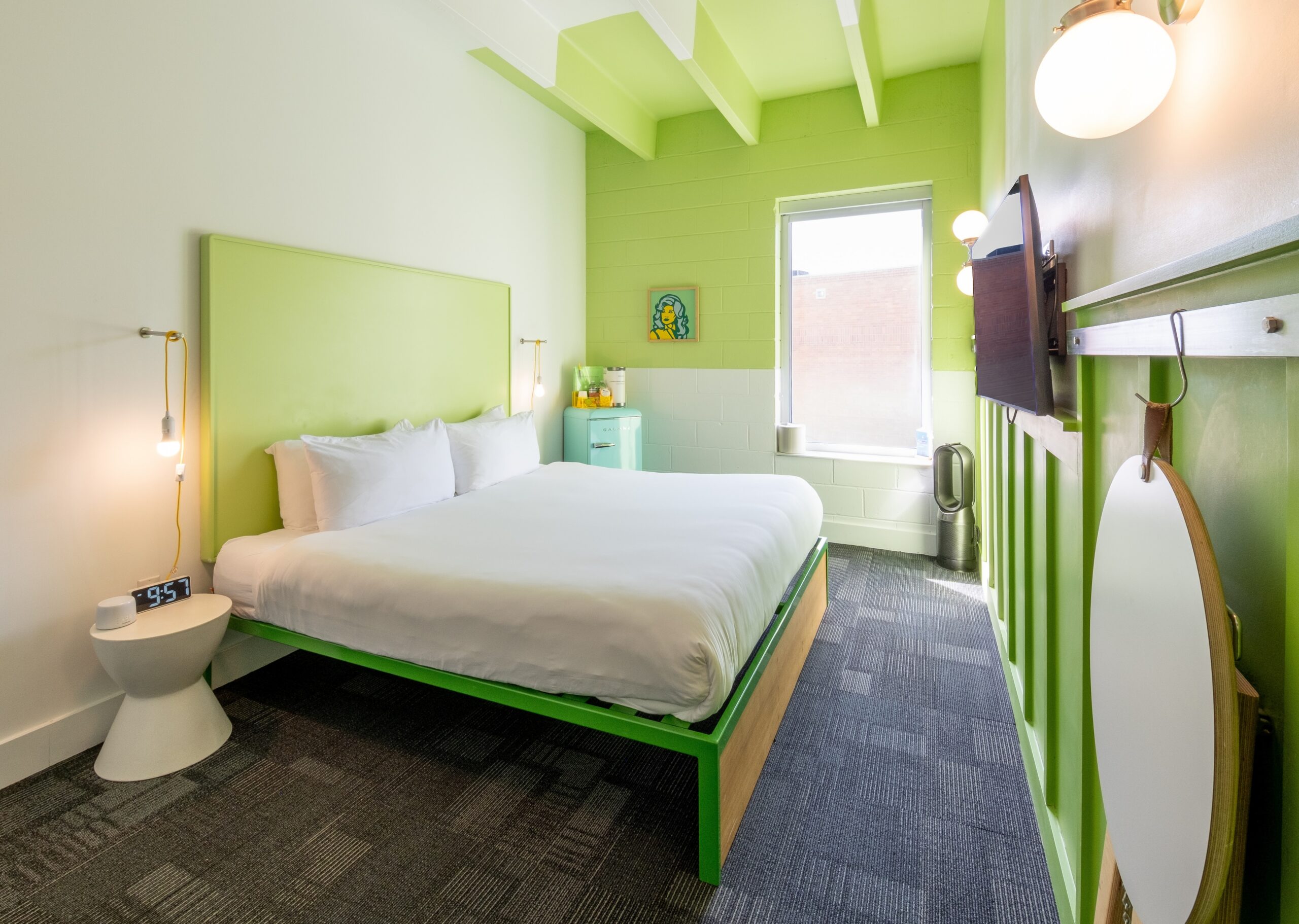 This beautiful King Room 217 features vibrant, insta-worthy green colorblock walls and ceilings, and a unique green-tiled shower. Room 217 also has the option to adjoin with room 216 to accommodate additional guests. Attentive features include walls adorned with local art, a Dyson hairdryer, a small basket of hand-selected local snacks, and much more!