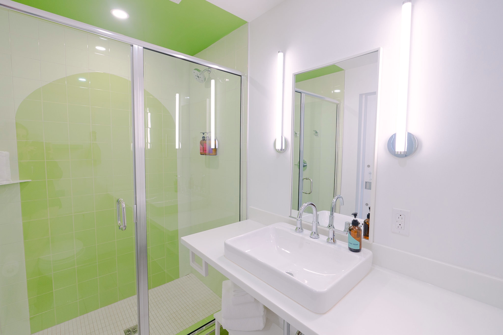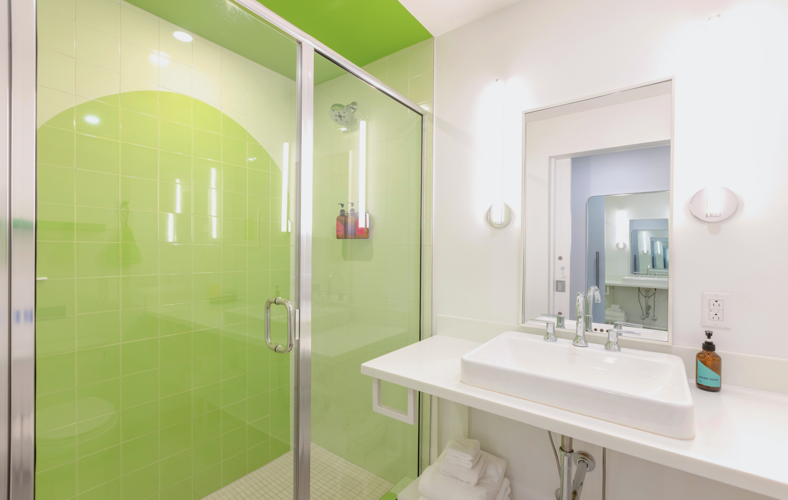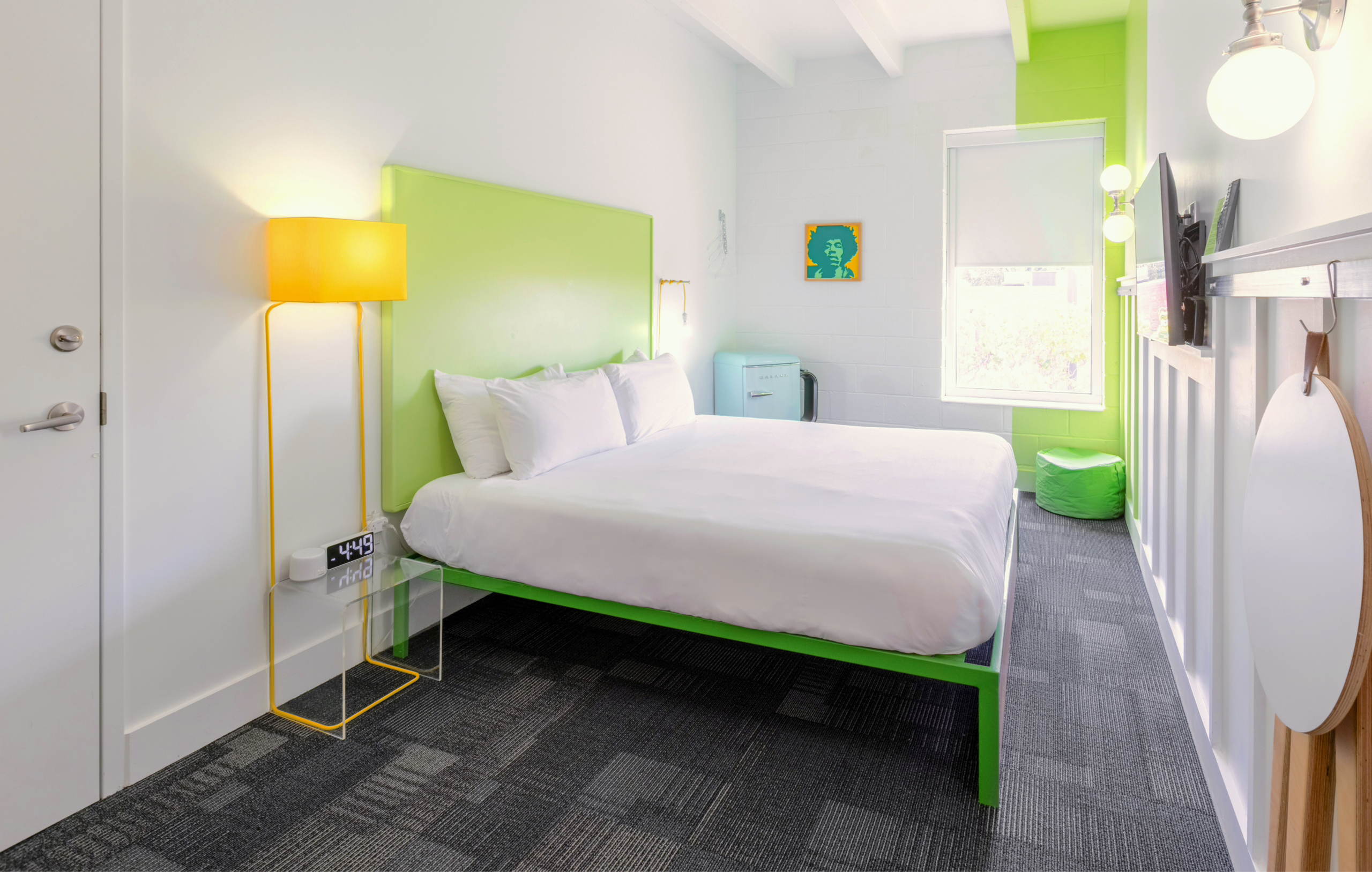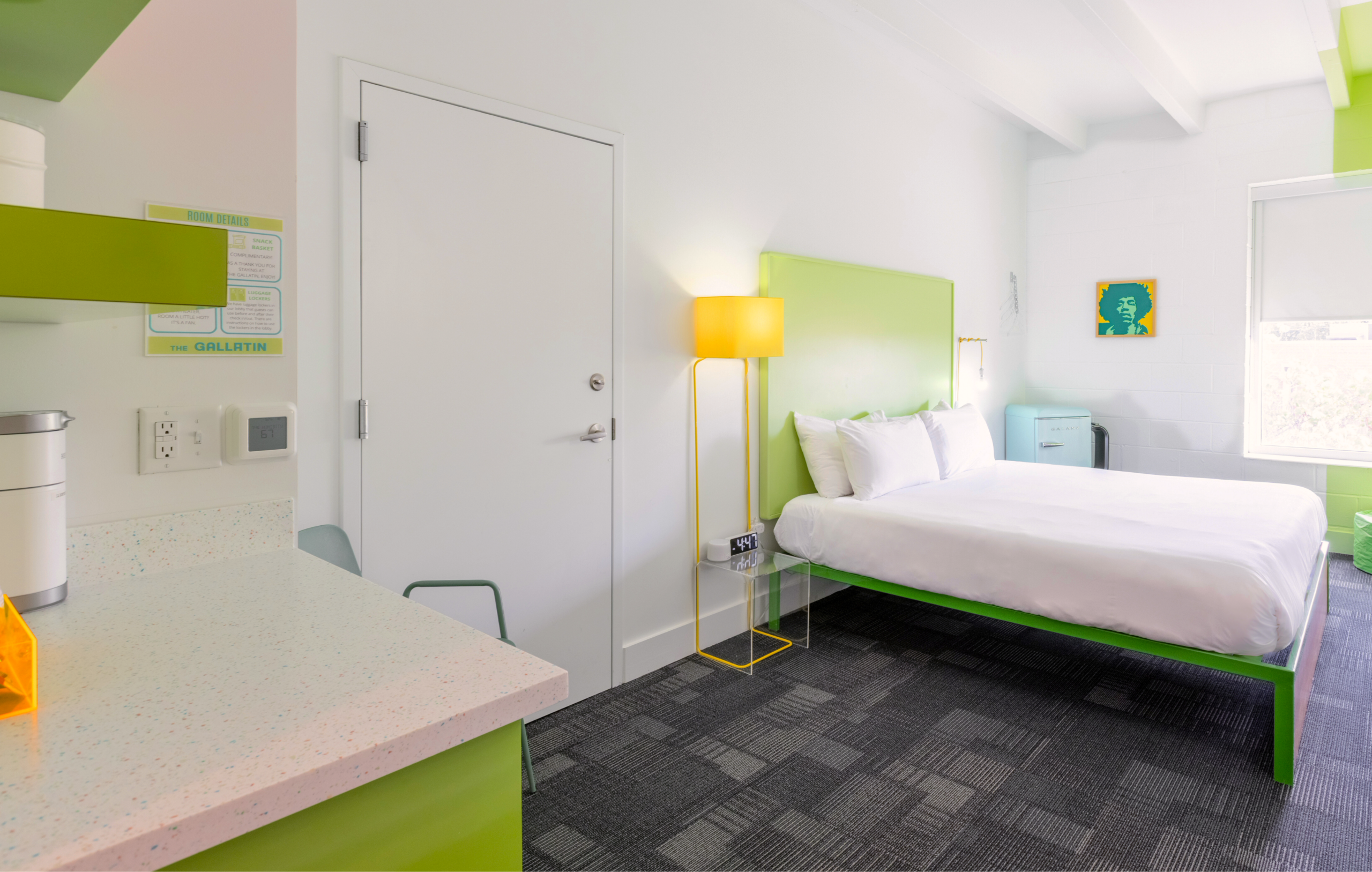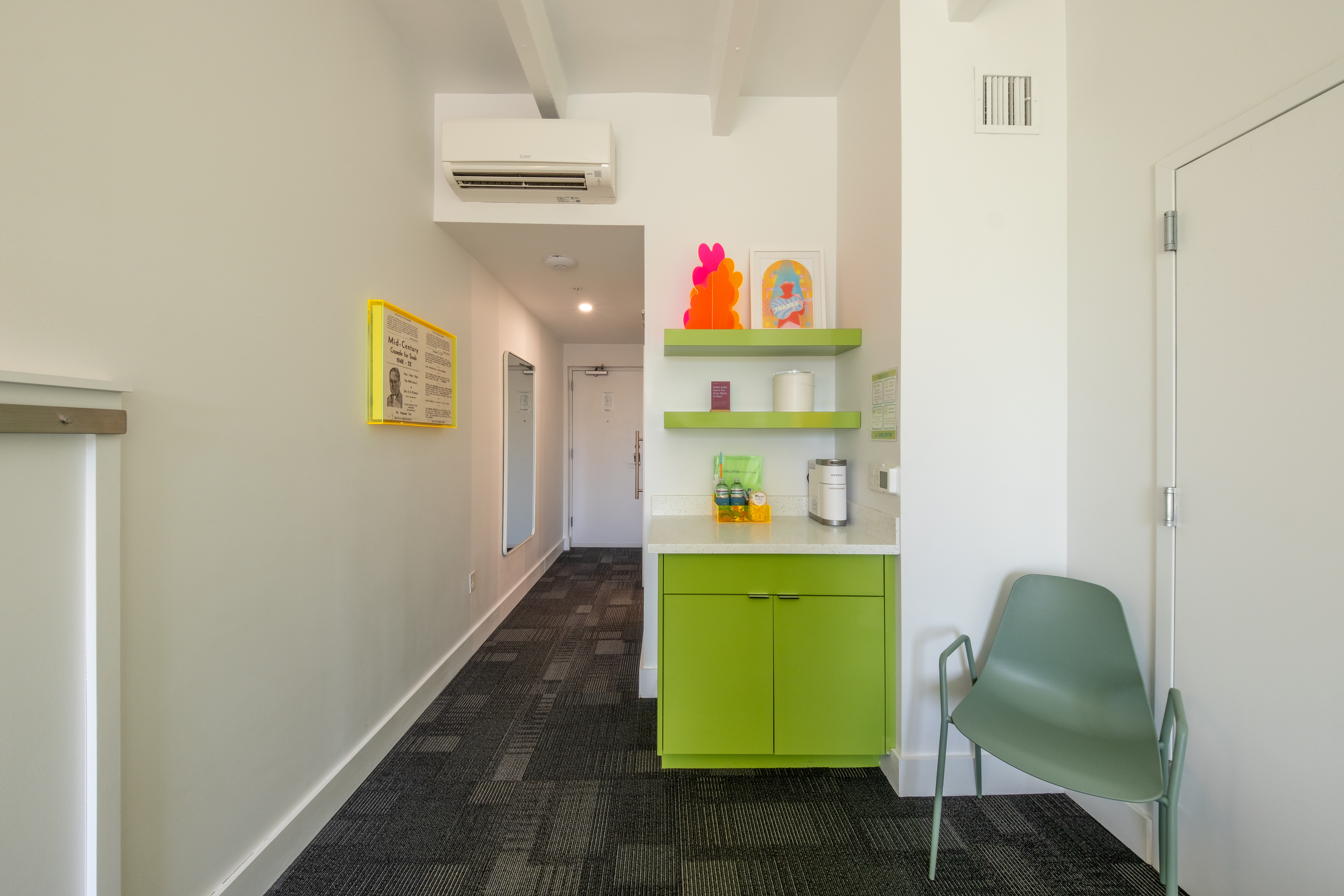 This beautiful King Room 316 features a splash of vibrant green on the walls, and a unique green-tiled shower. Room 316 also has the option to adjoin with room 315 to accommodate additional guests. Attentive features include walls adorned with local art, a small basket of hand-selected local snacks, a dry bar, and much more!