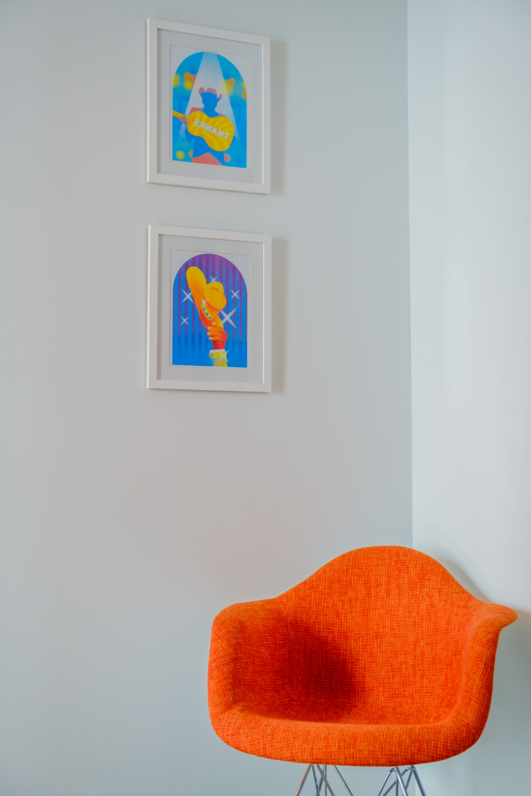 This beautiful Queen Room 212 features vibrant insta-worthy orange colorblock walls and ceilings, and a large orange-tiled shower. Attentive features include walls adorned with local art, a Dyson hairdryer, a small basket of hand-selected local snacks, and much more!