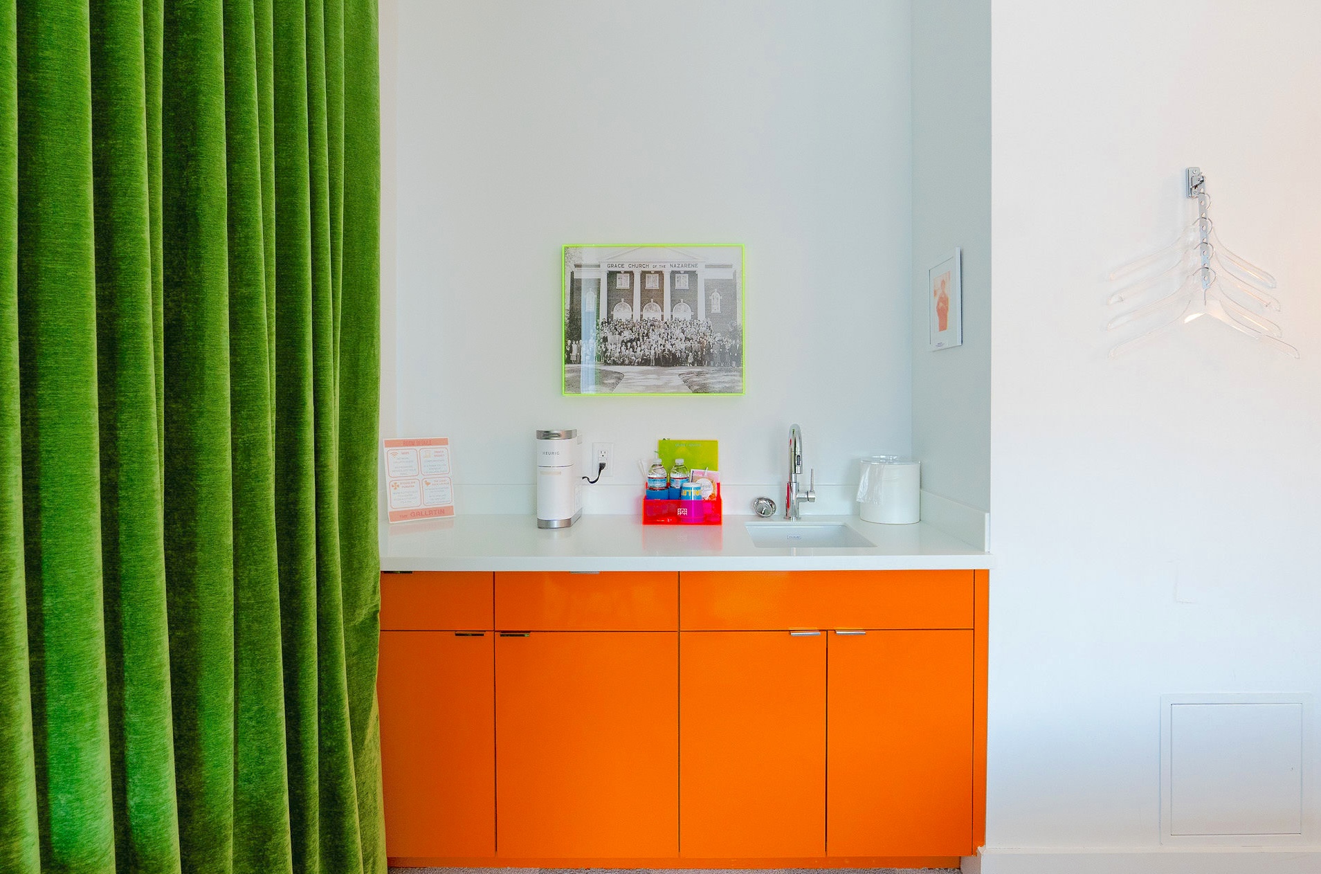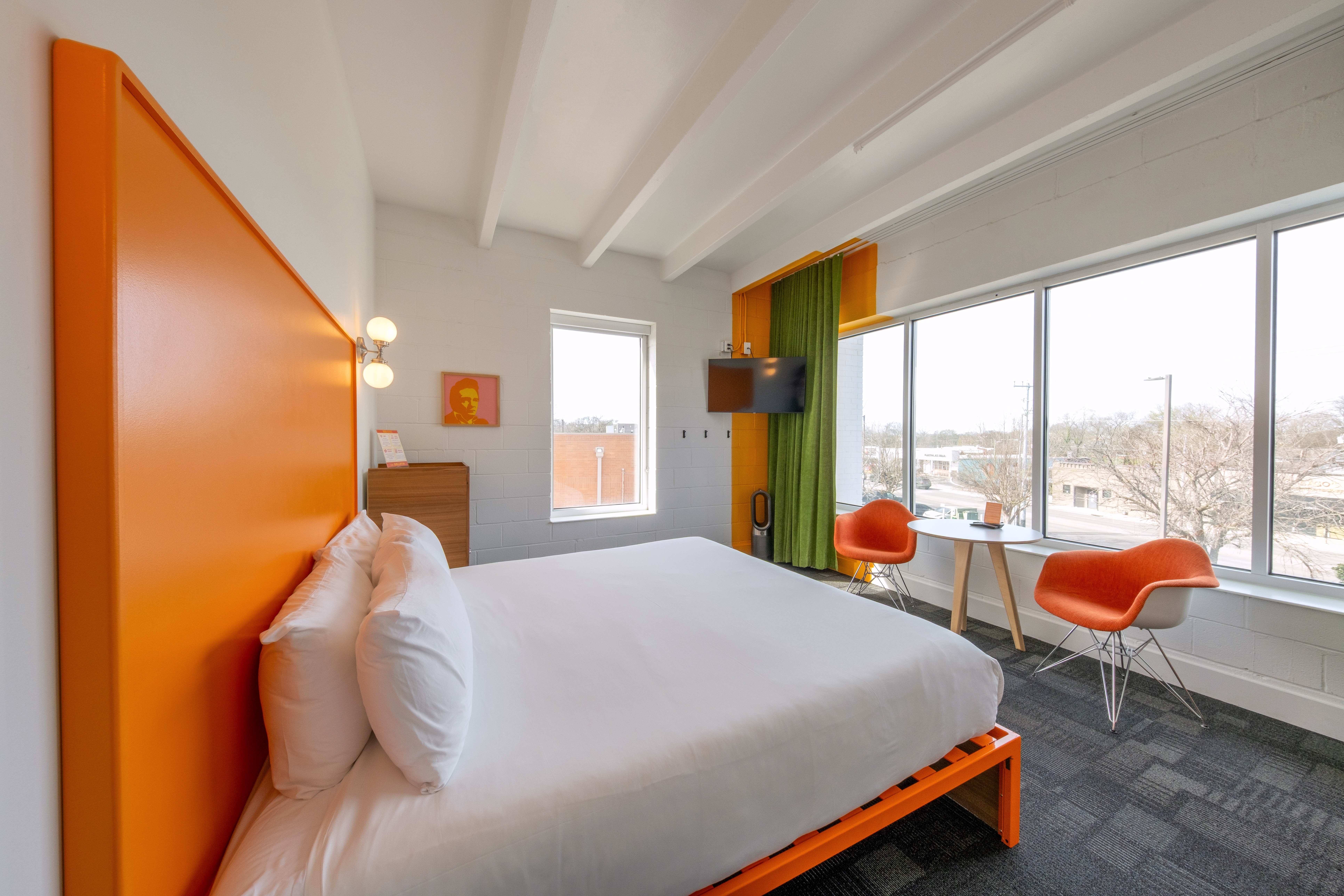 This beautiful deluxe king suite on the third floor features large windows that overlook the front lawn of the hotel, and illuminate the vivid orange walls. Vibrant orange tile and a luxurious freestanding tub make this colorful room an instagram page’s dream. Attentive features include walls adorned with local art, a dual sink vanity, a wetbar, a small basket of hand-selected local snacks, and much more!