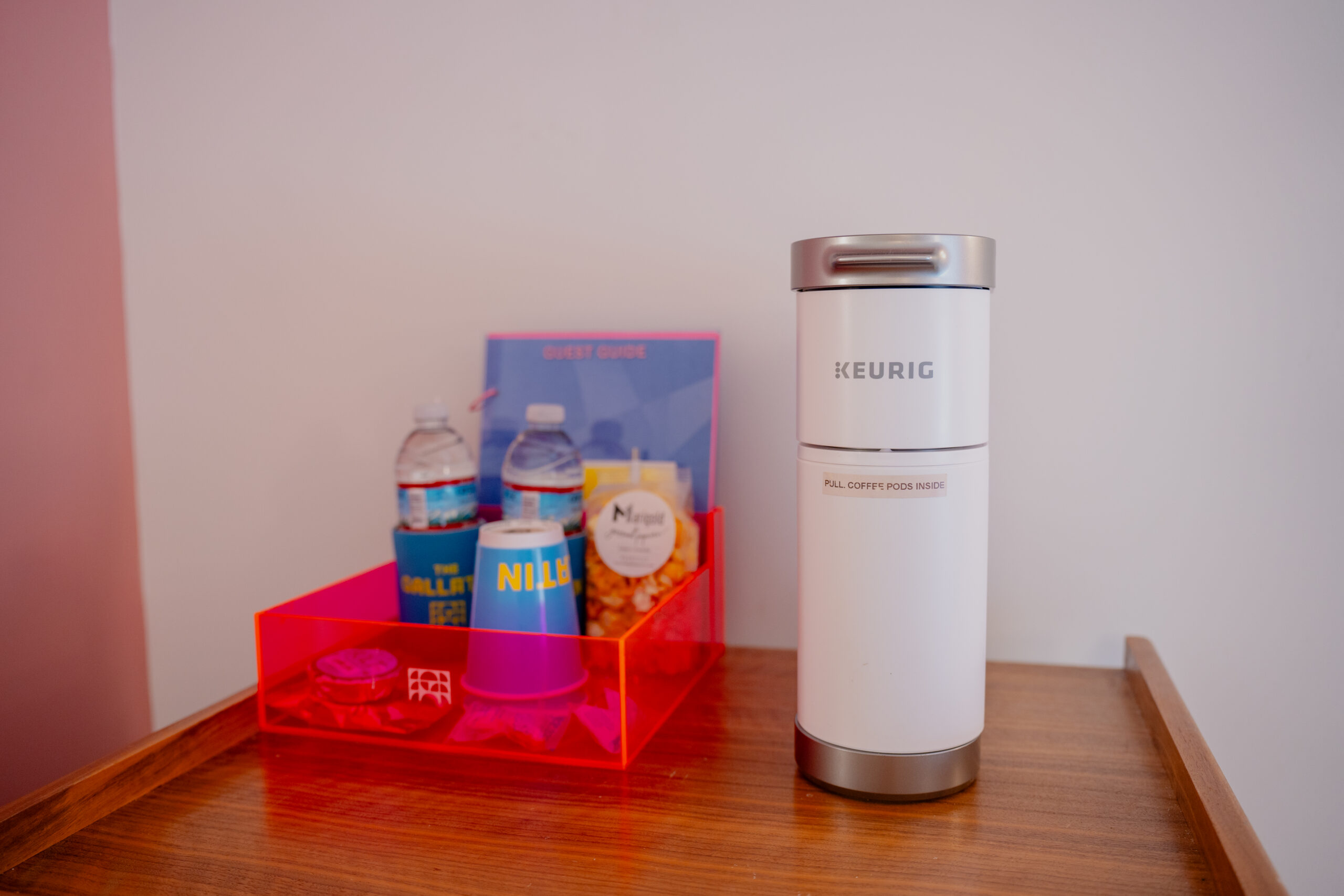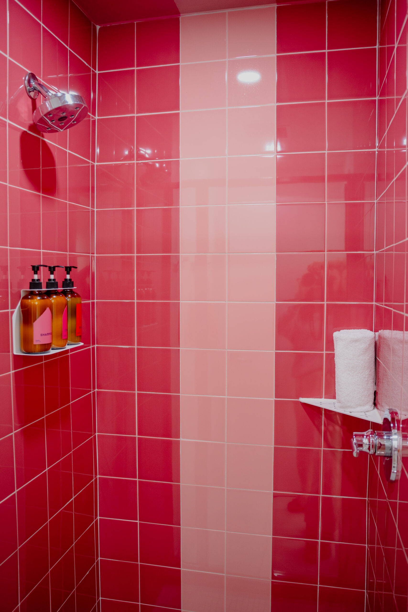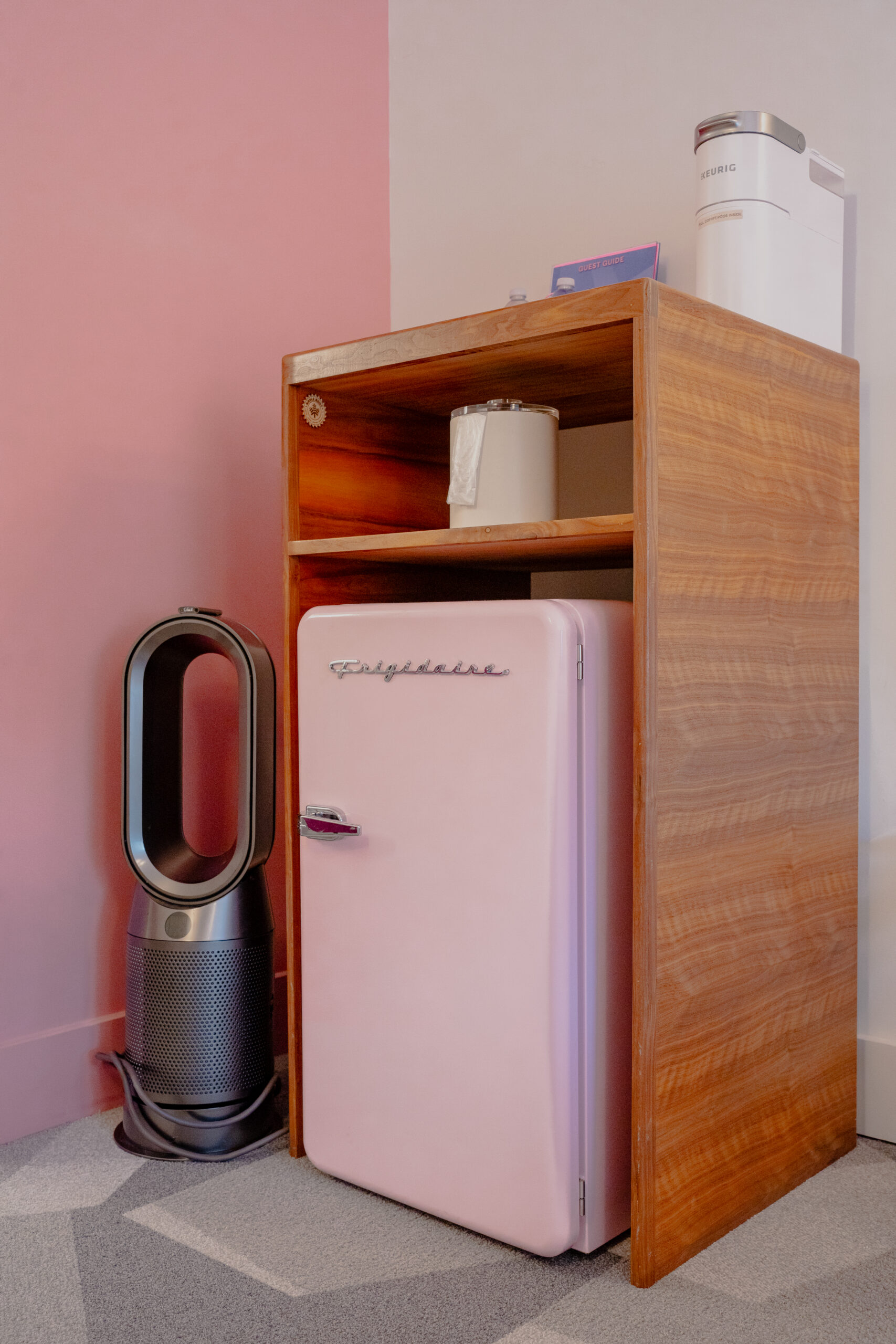 Classic Queen 216 features a custom-made queen bed, without compromising space. Vibrant insta-worthy pink colorblock walls and ceilings, and a matching pink-tiled shower bring an artistic flair to the space. Room 216 also has the option to adjoin with room 217 to accommodate additional guests. Attentive features include walls adorned with local art, a dual-sink vanity, a small basket of hand-selected local snacks, and much more!